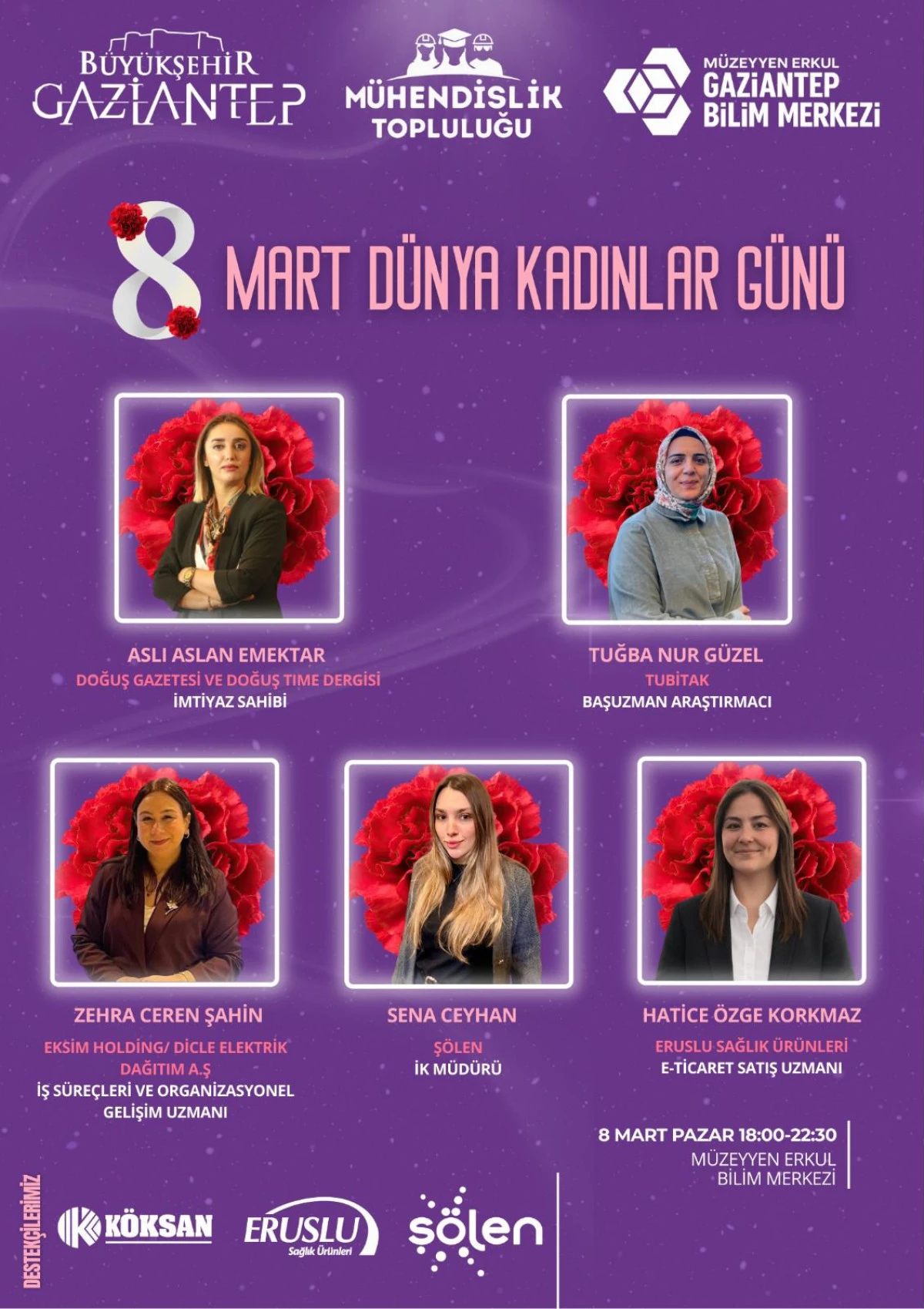 Gaziantep Üniversitesi Mühendislik Topluluğu tarafından düzenlenen 8 Mart Dünya Kadınlar Günü programında başarılı kadın isimler gençlerle bir araya gelecek. Program, Müzeyyen Erkul Gaziantep Bilim Merkezi'nde gerçekleştirilecek.