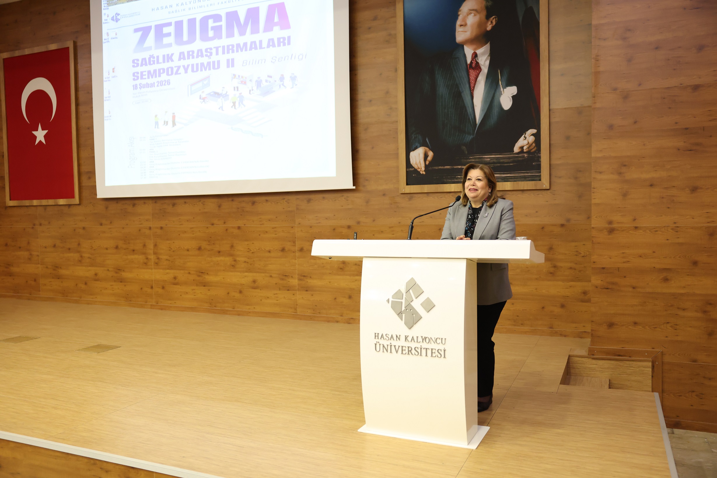 Açılış konuşmasında Rektör Vekili Prof. Dr. Gül Rengin Küçükerdoğan, 2018 yılında ilki gerçekleştirilen sempozyumun ardından ikinci kez düzenlenen bu bilimsel buluşmanın kurumsal istikrar ve akademik gelişimin göstergesi olduğunu belirterek; “Bu sempozyuma adını veren ‘Zeugma’ yüzyıllar boyunca medeniyetlerin kesişim noktası olmuş, bilginin, ticaretin ve kültürel etkileşimin önemli merkezlerinden biri, bir köprü olmuştur. Bugün burada akademi ile uygulama arasında, geleneksel araştırma yöntemleri ile yapay zekâ destekli yeni yaklaşımlar arasında bir köprü kuruyoruz. Teknoloji gelişebilir; ancak özellikle sağlık alanında bilimin merkezinde her zaman insan vardır. Bilim sabır gerektirir; çalışma gerektirir. Bugün sempozyumda sunum yapacak genç araştırmacılarımızı bu yolculuklarında desteklemek son derece önemlidir; bu bizim misyonumuzdur. Çünkü siz genç akademisyenlerin başarısı, üniversitemizin başarısıdır. Yazacağınız her tez, yayımlayacağınız her makale ve geliştireceğiniz her proje; yalnızca akademik bir çıktı değil, aynı zamanda ülkemizin sağlık sistemine büyük bir katkı sağlayacaktır” ifadelerini kullandı.