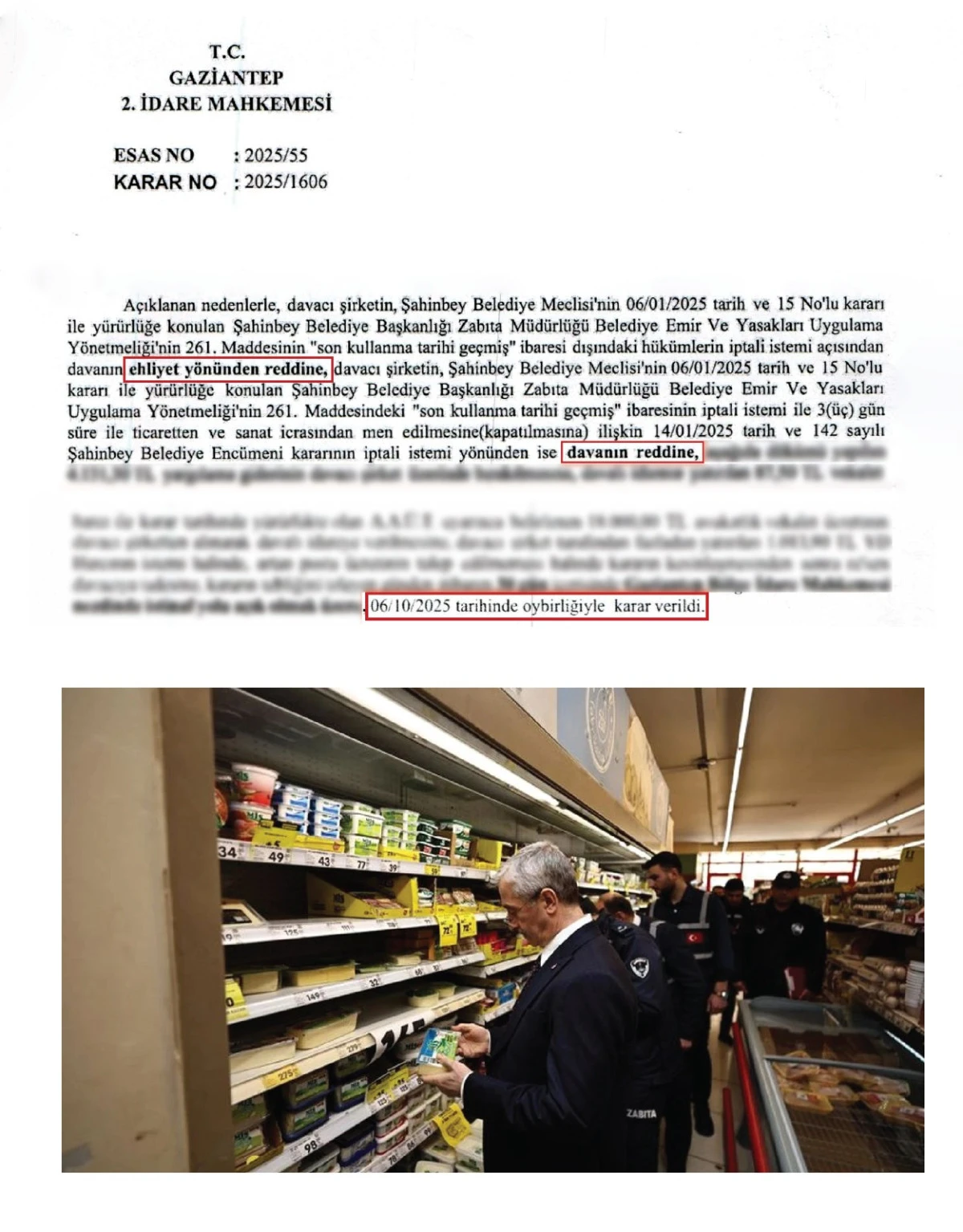 Şahinbey Belediye Başkanı Mehmet Tahmazoğlu, vatandaşın sağlığını korumaya yönelik çalışmaların kararlılıkla sürdürüleceklerini belirterek “Ocak ayında gerçekleştirdiğimiz rutin denetimlerde bir zincir market şubesinde son kullanma tarihi geçmiş ürünlerin satışta olduğunu tespit ettik. Halk sağlığını tehlikeye atan bu duruma göz yummadık ve işyerini 3 gün süreyle kapattık. Market yönetimi bu karara itiraz ederek belediyemizi mahkemeye verdi. Çıkan kararla, uygulamamızın tamamen kanuna uygun olduğu mahkeme tarafından da onaylandı. Bizim için en önemli konu vatandaşımızın sağlığıdır. Denetimlerimizi aralıksız sürdüreceğiz. Kimse halkın sağlığıyla oynayamaz. Bu karar, doğru yolda olduğumuzu bir kez daha göstermiştir” dedi.