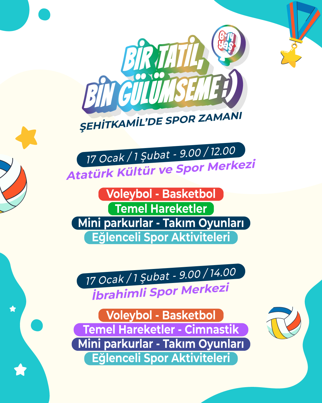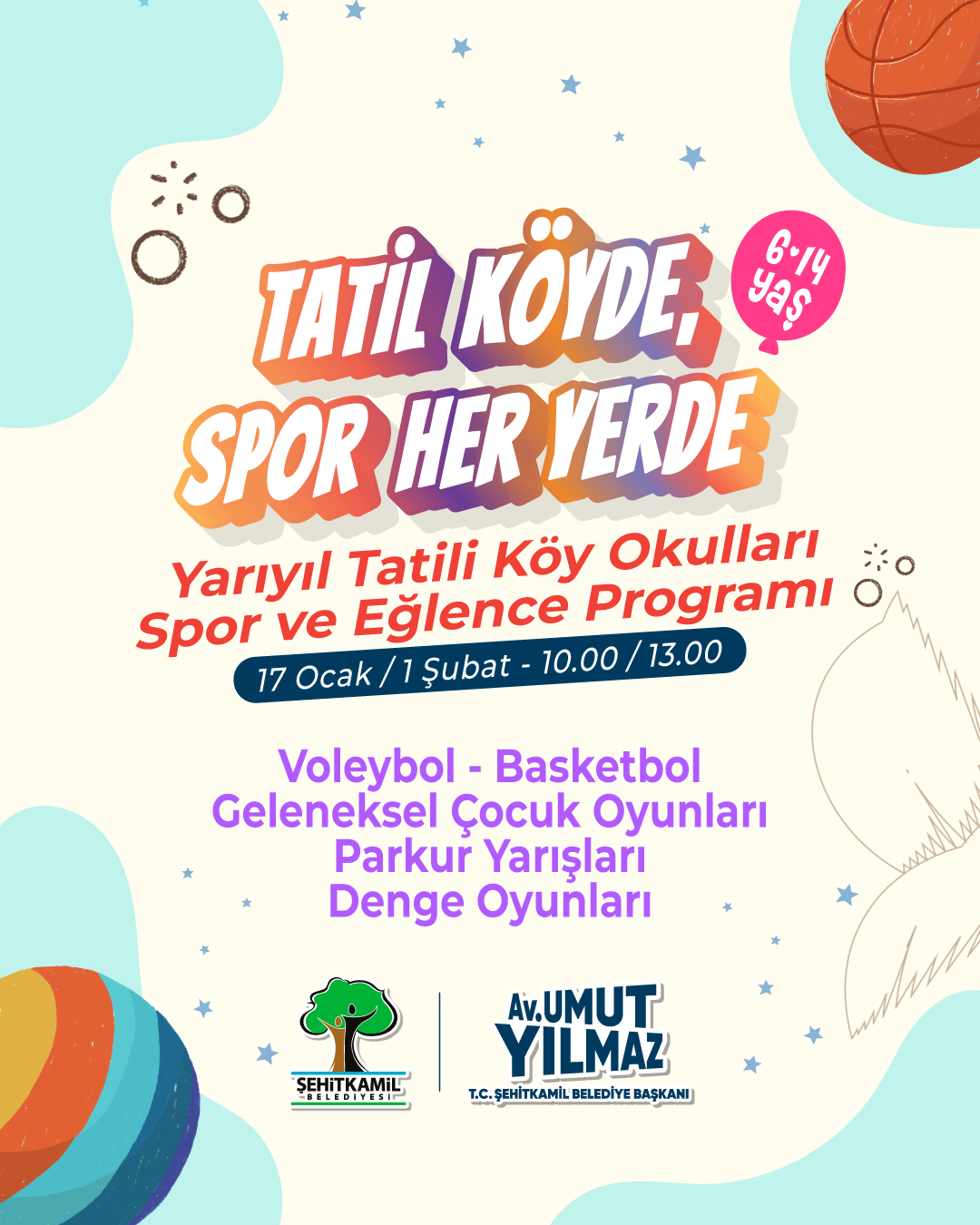 17 Ocak’ta başlayacak olan etkinlikler, 01 Şubat Pazar günü sona erecek. Program kapsamında voleybol, basketbol, temel hareket eğitimi, jimnastik, mini parkurlar, takım oyunları, eğlenceli spor aktiviteleri, geleneksel çocuk oyunları, parkur yarışları ve denge oyunları gibi birçok branşta etkinlik düzenlenecek. Minikler, hem eğlenerek vakit geçirecek hem de sporun temel kazanımlarını öğrenme fırsatı bulacak.