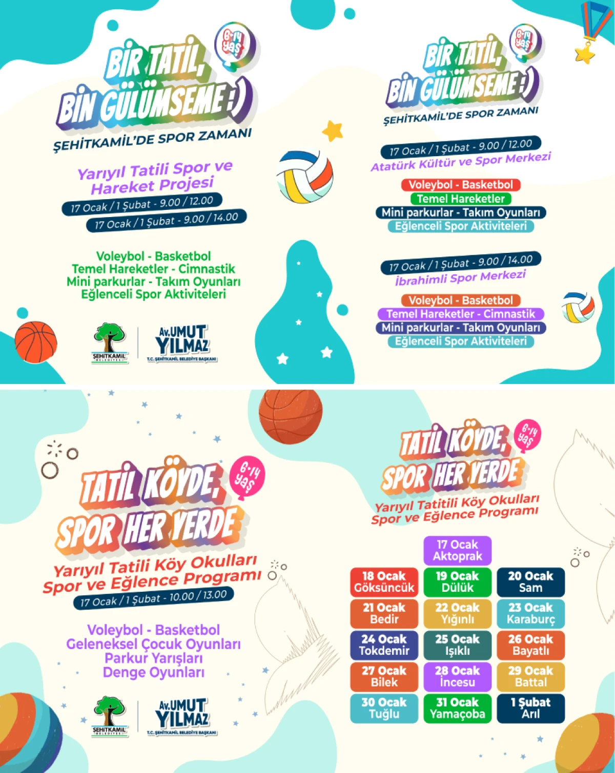 “Bir Tatil Bin Gülümseme” projesi ile de Atatürk Kültür ve Spor Merkezi ile İbrahimli Spor Merkezi’nde de 17 Ocak Cumartesi ile 01 Şubat Pazar tarihleri arasında her gün 09.00-14.00 saatleri arasında çeşitli spor ve eğlence etkinlikleri gerçekleştirilecek. Merkezlerde düzenlenecek programlarla kent merkezindeki çocuklar da yarıyıl tatilini aktif ve verimli şekilde değerlendirecek.
